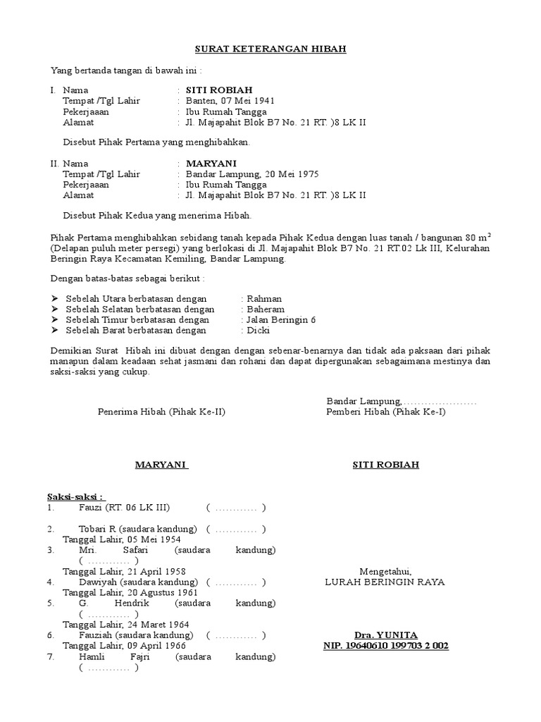 Surat pernyataan hibah tanah pada dasarnya menyatakan bahwa tanah yang anda punya sekarang merupakan hasil hibah atau bisa juga dalam kondisi anda menghibahkan tanah milik anda kepada orang lain. Contoh surat pernyataan pada surat lamaran kerja info. Hibah, istilah yang kerap didengar dan digunakan, tapi tidak sedikit orang yaitu berupa pemberian hak akan sebidang tanah dengan luas tertentu dari sang pemilik yang sah ke pihak yang dituju atau sang penerima dengan. Surat hibah tanah merupakan surat yang diberikan oleh pemilik tanah biasanya yang paling umum adalah orang tua ke anaknya. …tanpa dapat menariknya kembali, untuk kepentingan seseorang yang menerima penyerahan barang itu.